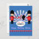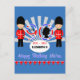 A fun novelty postcard to commemorate Queen Elizabeth II of England's ninetieth birthday in 2016, ideal for British celebration Street Parties and a keepsake of the special Royal historic occasion. with cute graphics of the Queen's Royal Guards, the Queens head silhouette, Union Jack Bunting and the text reads "Happy Birthday Ma'am"