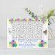 Send an invitation to a birthday party featuring a drawing of a Western cowgirl positioned at the entrance of the Maze with a horse at the end of the Maze. The greeting is "Happy Birthday to an Amazing Girl! "Help the girl find her way through the maze to her horse," is written below the greeting. Clusters of blue, green, yellow, pink, and orange balloons are featured on the card. On the back is the invitation with the date, time and place. All of the text is set up to be personalised if desired.