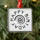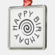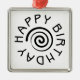 An attractive happy birthday ornament with circular text and a spiral motif.