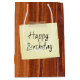 Yellow square note paper with tape and Happy Birthday text on a wood background.