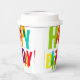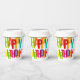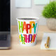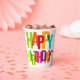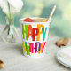 A colourful paper cup adorned with vibrant letters spelling 'Happy Birthday' in various hues. The cup is set against a clean, light marble background, emphasizing its festive design. The bold typography creates a playful and cheerful atmosphere.