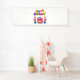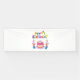This banner showcases a design that has a birthday cake displaying the words "Happy Birthday" on top in a bubble style print font with gifts and balloons on each side. This design also features a cartoon style happy birthday with party hat and shapes inside of the letters across the top in this birthday theme and style. This banner has single side printing outdoor safe measures 2.5"x8" made with an elegant matte finish and is both fade and tear resistant for Indoors or outdoor use great for advertise anything, from birthdays to graduation, weddings to anniversaries. Hemmed and thermally welded edges for neat finish outdoor banners can be bought with metal grommets.