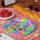 Custom Birthday paper plate - HAMbyWhiteglove aka HAMbyWG design, has a gorgeous striped, brightly coloured background with matching, multi-coloured, small and large hearts, the words, "You are loved," and "Hugs & Kisses," with templates for the child's name. Our logo authenticates we created it! Choose the personalise and customise options to change granddaughter, to daughter, niece, friend, etc., add info, download photos and choose font colours! Use