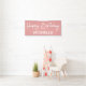 Basic, simple pink and white "Happy birthday" party banner customised with the name of the guest of honour in a whimsical script font.