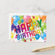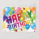 A vibrant birthday card design featuring a colourful array of balloons in various shapes and sizes. The word "Happy Birthday" is prominently displayed in bold, playful letters,