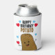 Fun happy brown potato surrounded by red and blue love hearts with Happy Birthday Potato in black and brown lettering above his head.