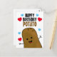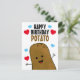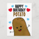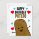 Fun happy brown potato surrounded by red and blue love hearts with Happy Birthday Potato in black and brown lettering above his head.