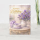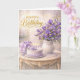 A graceful, cottage-inspired birthday illustration showcasing a lush bouquet of purple irises arranged in an ornate vintage pitcher. A delicately frosted lavender cake with glowing candles, pastel gift boxes, and soft lace textures create an atmosphere of elegance, calm, and heartfelt celebration.