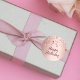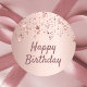 A sticker for a girly birthday party. A rose gold background with an elegant rose gold, copper coloured pink dripping, shining stars. The text: Happy Birthday is written in dark rose gold with a large modern hand lettered style script.