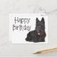 This charming Happy Birthday greeting postcard features a black Scottish Terrier dog highlighted against a crisp white background.