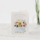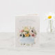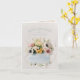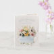 This beautiful Birthday card features a photo of a medical mask with a sweet bouquet of white and pink poppies and ranunculus blooms. Above the bouquet in curved blue text it says "Happy Birthday" in capital letters. Below it says "from a social distance" The inside of the card has a light blue watercolor background on the left and an aged cream watercolor background on the right.
