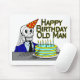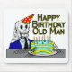 A funny birthday design featuring a skeleton man with party hat and spider webs strung all over, sitting in front of his birthday cake. Happy birthday old man!