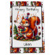 Personalised gift bag. Adorable birthday squirrel in a birthday hat holding a gift in the woods surrounded by acorns.