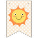 "Happy Birthday" party flags for kids and adults featuring smiling yellow sunshine cartoon faces with alternating blue and gold polka dots and bold, handwriting style lettering.