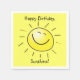 Perfect for a child’s party, here is a package of 50 white paper cocktail napkins with an image of a smiling yellow sun and the optional sentiment “Happy Birthday, Sunshine!” on yellow. See matching cloth napkin, kitchen towel, cloth placemat, paper placemat and coasters. See the entire Birthday Napkin collection in the FOOD/BEV | Linens section.