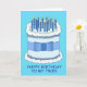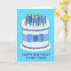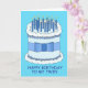 A large cartoon blue and white cake covered in candles, set against a turquoise coloured background. The words 'Happy Birthday to my Twin' accompany the image.