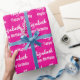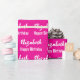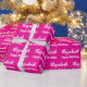 The birthday wrapping is hot pink. It has a text pattern for the recipient's name in a script and the phrase Happy Birthday. The name (Shown: Elizabeth) appears in an elegant script. The text is white. All of the text can be edited.