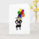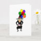 A drawing of a funny looking witch holding a birthday cake and balloons.