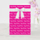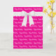 White happy birthday text, and a white bow on a neon pink background for a birthday.