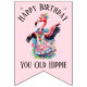 Happy Birthday You Old Hippie Retro 60s 70s style birthday party banner. A vintage inspired design featuring a pink flamingo wearing a tie dye dress and dancing freely in a field of flowers at one of those notorious music festivals that went down in history. Whether the birthday person is a hippie at heart or simply loves that groovy 1960s and 1970s vibe, this fun birthday banner is sure to get laughs. Perfect for friends, family members, or coworkers who survived the Sixties and Seventies in style!