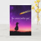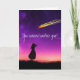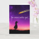 A funny birthday card which says: you survived another year. With an image of a vivid and colourful purple sky in the twilight evening with a blanket of stars covering the sky. A silhouette of a girl standing on a hilltop looking up high into the sky, watching as a glowing meteor fireball is heading towards earth about to crash down.