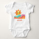 Celebrate a new arrival with this cheerful and vibrant summer baby bodysuit. It features a friendly smiling sun peeking over a series of colorful, flowing rainbow waves in a hand-drawn style. This charming piece makes a perfect gift for a boho-themed baby shower or a first birthday celebration.