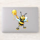 A vinyl decal with a happy black and yellow cartoon honey bee, standing up on his hind legs wearinh little shoes. Standing with a scoop of honey dripping down from a honey stick. His arms raised up in the air and a big smile on his face, thrilled to have so much honey.