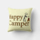 The saying happy camper with a stick figure roasting marshmallows over a campfire.