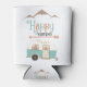Cute digital art features "Happy Camper" text, Boho style arrow, mountain silhouette and retro style RV travel trailer