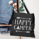 Custom printed tote bags with trendy black and white "Happy Camper" typography quote. Design features a tribal arrow border and cute teepee graphic. Use the design tools to choose any background colour, add your own text and photos to create a unique one of a kind design.