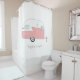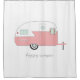 This shower curtain features an original illustration by Charming Ink of a pink retro camper, also known as a caravan. The script font proclaims — happy camper. Change the message or personalise with names.