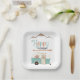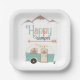 Whimsical paper plate design features "Happy Camper" text, Boho style arrow, mountain silhouette and retro style travel trailer