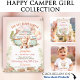Cute happy camper Toddler Girl t-shirt for 2nd and any little girl Birthday featuring the cutest little bear, balloons, van and mountains in pink, orange and comforting colours. It captures the spirit of fun in the sun on your backyard bbq, picnic, mountains or any outdoor birthday party :) Easily personalise all the text or leave some blank. - Kate Eden Art.