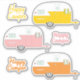 This retro camper sticker set will make you happy. Orange, yellow and pink illustrated campers along with fancy script lettering will dress up your stuff.