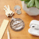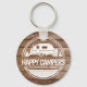 A simple yet stylish keychain with the phrase 'Happy Campers'. Customise with your family name. Shown with a rustic wood slat background, perfect for holding your camper or motorhome keys.