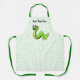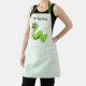 This kitchen apron is white with bright green polka dots and a smiling cartoon snake with big white eyes who is vibrant green and yellow. Customise your text with the template.