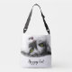 Funny Cat animal pet lies on its back and looks at you. The text Happy Cat on the front. The text I'm happily owned by a cat on the back. Elegant cross-body bag for anyone. Customisable. You can change or delete the image and two texts. You can also transfer this design to another product of your choice, just use an option to the right of this description.