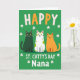 Designed with three stylized cats sitting shoulder to shoulder, this St. Patrick’s Day scene turns “St. Patrick’s Day” into “St. Catty’s Day” with a wink and a little warmth between friends. A sleek black cat with yellow eyes and tiny pink inner ears sits on the left, looking calmly toward the others as if keeping close watch. In the middle, a white cat dotted with lime-green spots smiles with an open mouth, leaning into the group’s cozy, friendly energy 💚. On the right, an orange tabby wears a small, content grin, rounding out the trio like a familiar companion you’re glad to see again. Above their heads, “HAPPY” appears in cutout-style letters that alternate soft white and orange, centered near the top. Across the deep green background, small white shamrocks are scattered like confetti, adding an easy holiday touch ☘️. Below the cats, “ST. CATTY’S DAY” is written in crisp white text, with “Nana” placed underneath in the same white. Share St. Patrick’s Day sentiments with a smile as white shamrocks dot the emerald field around the three cats.
