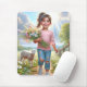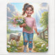 Cute little girl walking down a dirt path and holding flowers. White lamb is following her.
