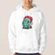 Standalone design of a happy turquoise/green alien with big pink eyes in a Santa Claus Costume.