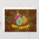 Colourful, whimsical, and fun Happy Christmas Ornaments holiday design greeting invitation card features three pretty ornaments with stars and dots in pink, aqua, orange, and yellow on a background of brown with colourful snowflakes of aqua, orange, yellow, and pink. Bright yellow text reads Happy Christmas! You can easily customise the back of these holiday greeting invitation cards with your own text message.