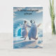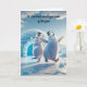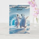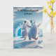 Two penguins appear to be joyfully dancing in front of an igloo under a clear, sunny sky