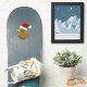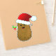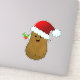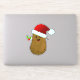 Happy Christmas Potato wearing a red Santa hat with a white fur trim and a white fluffy pompom. His body is brown with small black dots for eyes and a big happy smile. He has sticks for arms and is holding green holly leaves with red berries.