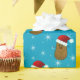 Repeat pattern of a happy Christmas potato in a Santa hat. Blue background with white snowflakes.