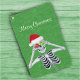 This golf towel has a happy skeleton in a red Santa hat holding red and green snowflake ornaments up to his eyes on a green background with faux gold sparkles. Customise your text with the template.
