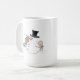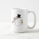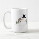 Illustration of a cartoon style Christmas snowman in a snow scene with snow covered houses and a tree in the background.