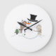 Illustration of a cartoon style Christmas snowman in a snow scene with snow covered houses and a tree in the background.