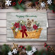 The front of this fun Holiday greeting card has a delightful image of an adorable Yorkshire Terrier in a wicker basket. The basket is decorated with poinsettia floral bouquets and a bright red bow. The customisable text above the image says "Happy Christmas" in green script. Everything is placed on a rustic grey wood panel background. The inside has two more text fields for you to customise as you like.