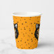 These paper cups have a happy classic Halloween black cat face with open mouth and bright eyes along with orange and white accents on an orange background with tiny black stars.