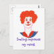 Fun and cheerful painting of a happy clown face, with the words, Smiling improves my mood, printed on postcards. Bless you in having a more positive day.